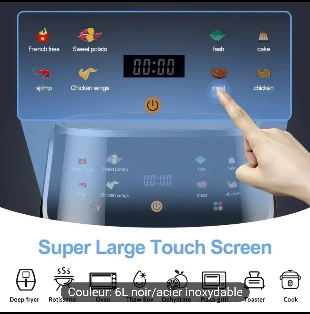 Découvrez l'Air Fryer , idéal pour préparer des plats sains et délicieux sans excès d'huile. Avec une capacité de 8L, cet appareil est parfait pour les familles ou les repas en groupe. Sa puissance de 1400W et sa température ajustable entre 80°C et 200°C vous permettent de cuire une variété de plats, du rôti au grillé.